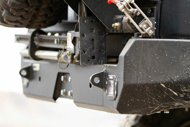 Two 3/4" thick pull points, pierce though the main shell and are welded directly to the inner substructure of the bumper, not just to the main outer shell. Pivot system is Metal-tech 4x4's proprietary: MotionX Pivot featuring twin tapered radial bearings and lip seal to keep dust and water out and grease in, fully serviceable, and rated for 2000lbs. Standard features include adjustable offset tire mount that holds up to 36" tire, lowest commercially available Hi-lift jack mount, CB/HAM/sand flag antenna mount. Swing arm comes pre laser cut for optional accessories to bolt to it, like duel fuel can holders or other to be released accessories.