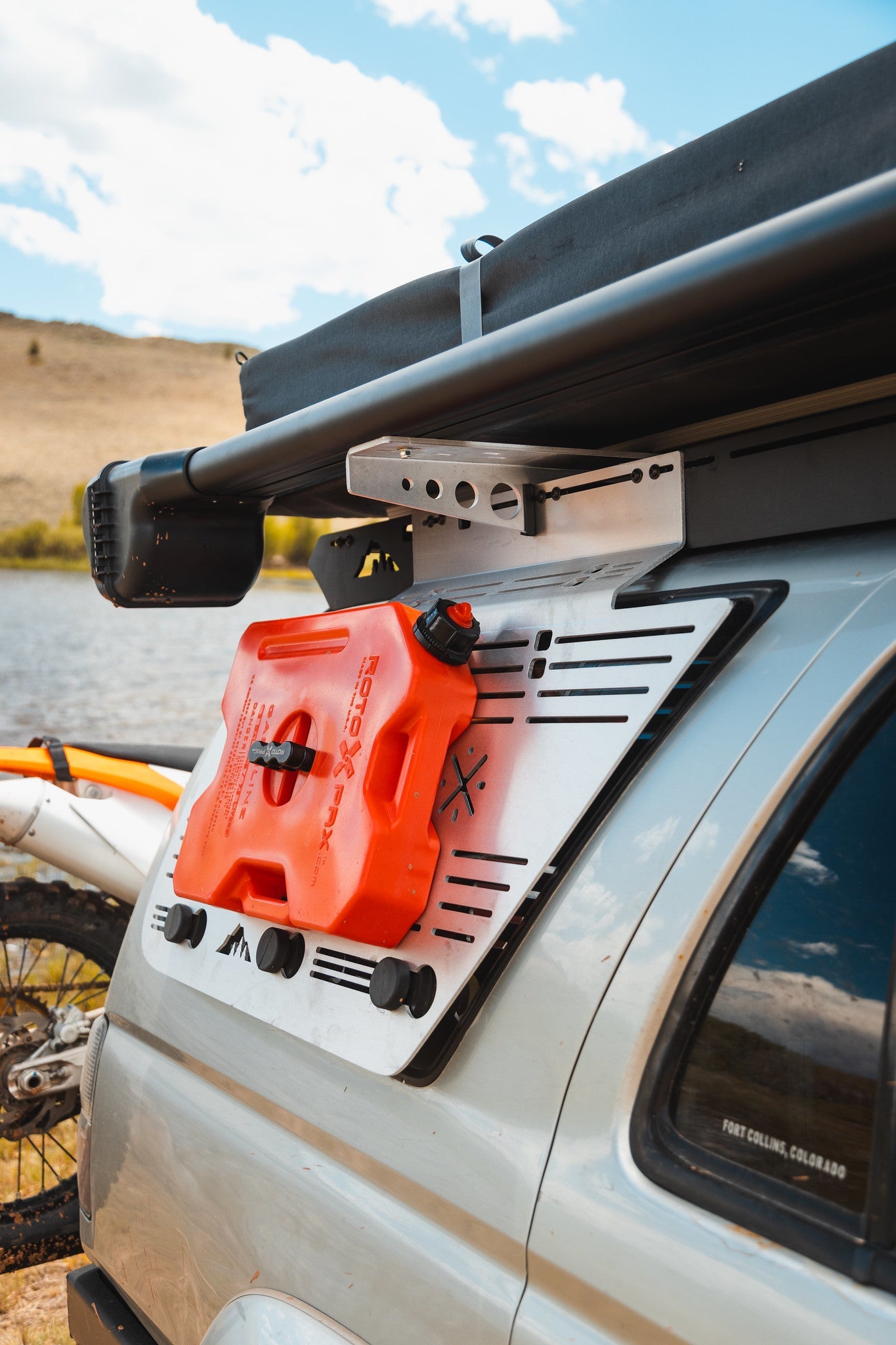 A new way to mount your essential gear for easy access and more storage on your 3rd Gen 4Runner. Made out of 3/16 aluminum, this lightweight yet strong panel allows you to add convenient mounting options to the side of your vehicle. Perfect to mount your recovery gear, fuel, water, shovel, axe, first aid kit, or nearly anything that can be bolted or strapped down. Compatible with most standard awnings using Sherpa Awning Mounts. Designed to match the window shape of your 4Runner, this bolts to your Matterhorn or Antero rack at the top and suctions to the window at the bottom. No drilling or other modifications are necessary.