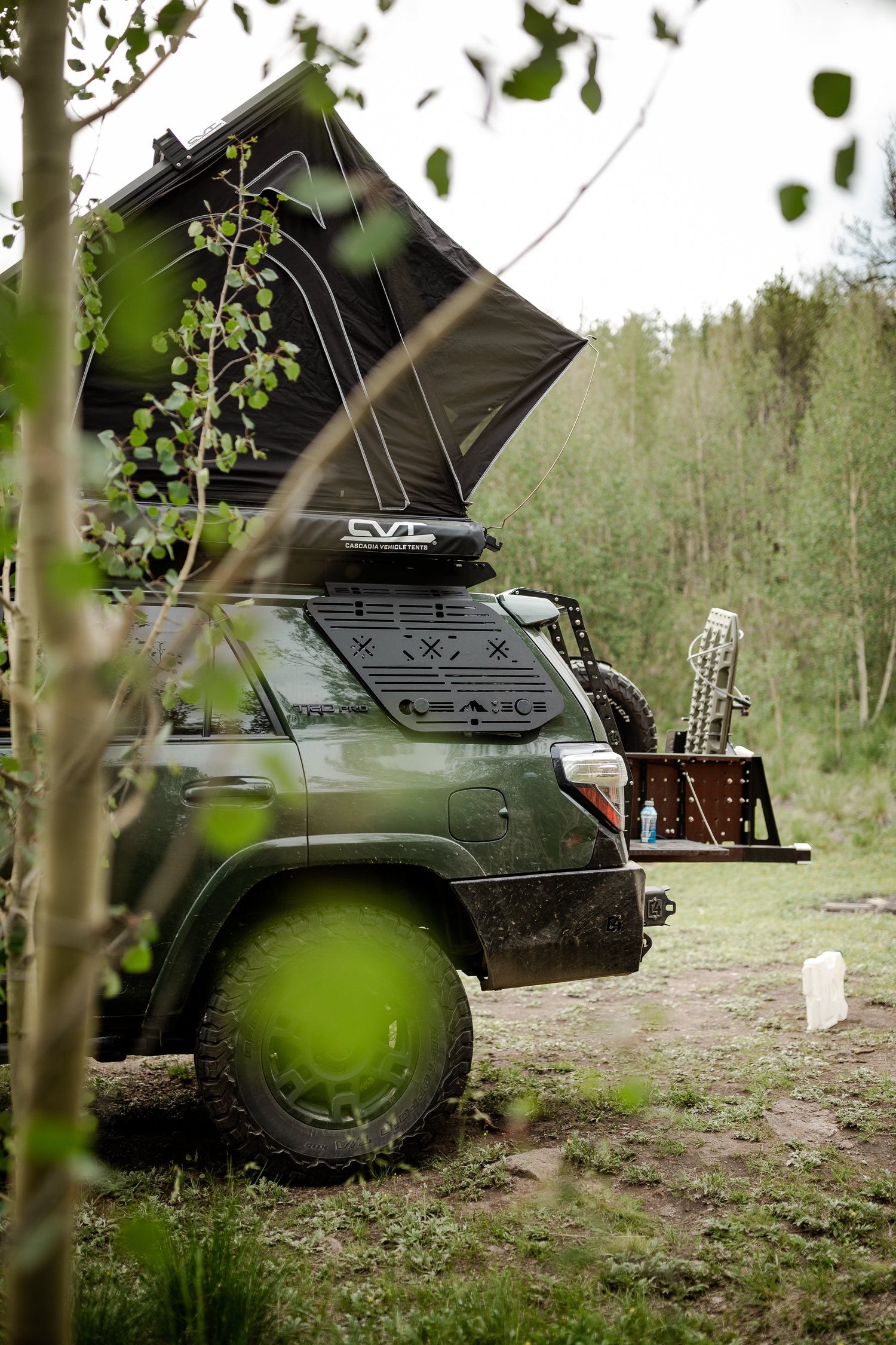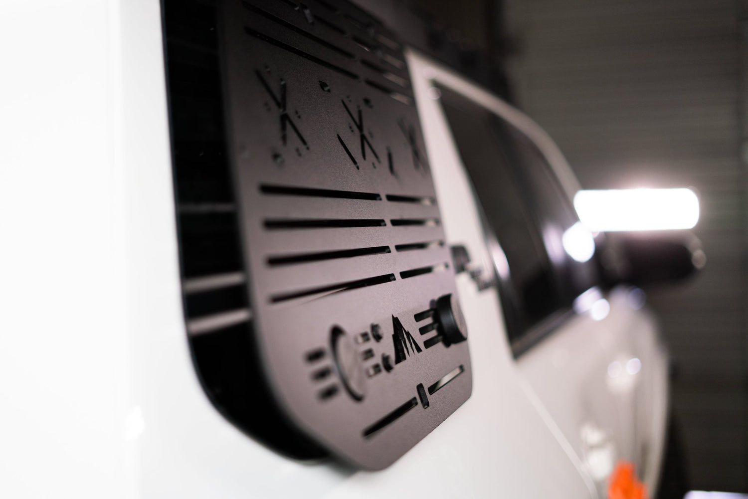 A new way to mount your essential gear for easy access and more storage. Made out of 3/16 aluminum, this lightweight yet strong panel allows you to add convenient mounting options to the side of your vehicle. Perfect to mount your recovery gear, fuel, water, shovel, axe, first aid kit, or nearly anything that can be bolted or strapped down. Compatible with most standard awnings using Sherpa Awning Mounts. Designed to match the window shape of your 4Runner, this bolts to your Crestone or Needle rack at the top and suctions to the window at the bottom. No drilling or other modifications are necessary.