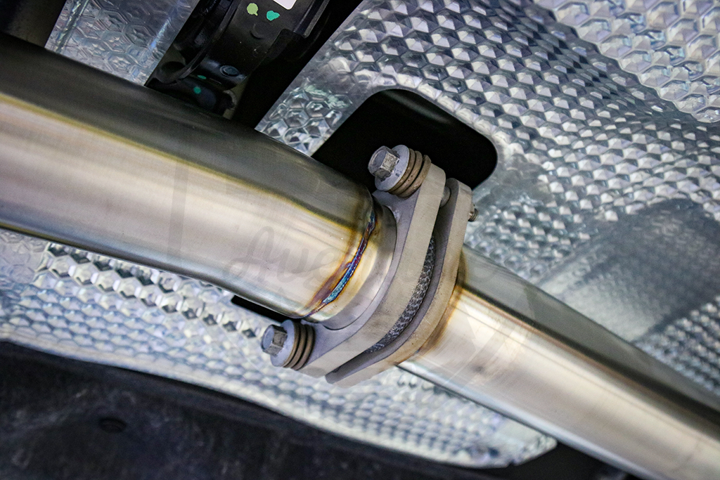 Equipped with a 1/2 inch thick inlet flange for reduced distortion and a flex pipe to allow for movement, it is a true 3 inch catback all the way through. The inlet flange will also virtually fit any available J-Pipe. A flex section was added to minimize vibrations and stress.