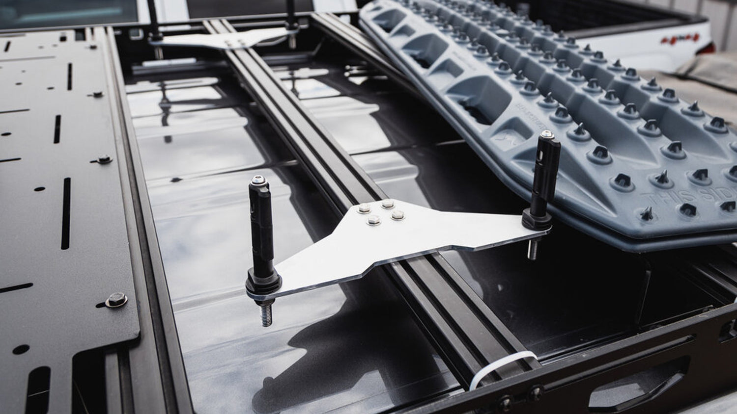 Designed to work with MaxTrax, ActionTrax, and TRED traction board devices. It allows for easy mounting both parallel and perpendicular to the crossbars.