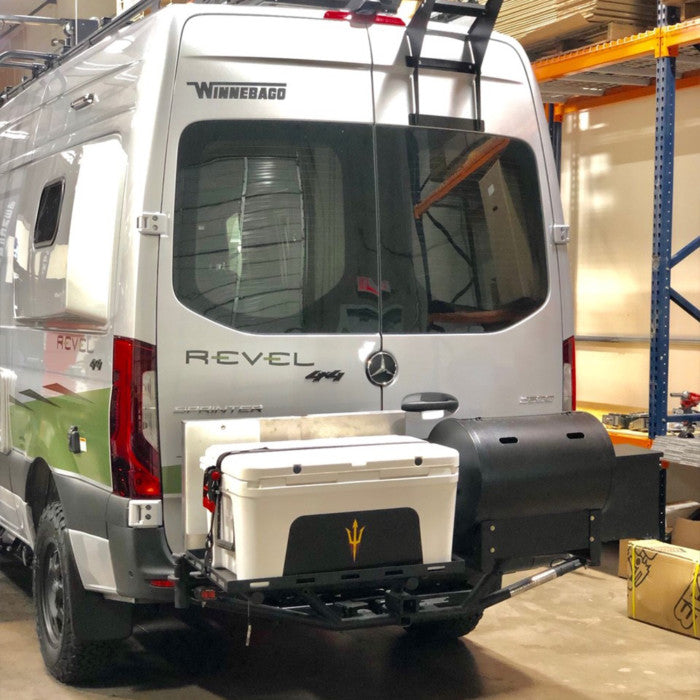 This Hitch Mount Rack comes equipped with a driver side tire mount arm and a passenger side grill mount arm. It has a high lift jack mount with light tabs included (jack and lights are not included), auxiliary hitch receiver, and two stainless steel CNC bottle openers. Hitch Mount Rack with Cooler/Work Table & Grill Mount:Driver Side Added Cooler Mount + Stainless Steel Work Table to the Tire Rack Base size of up to 32.125″ length by 18.125″ width. This also include the work top table Passenger Side Replaced Tire Rack with a Mount for a TREAGER® Grill Grill not included in price.