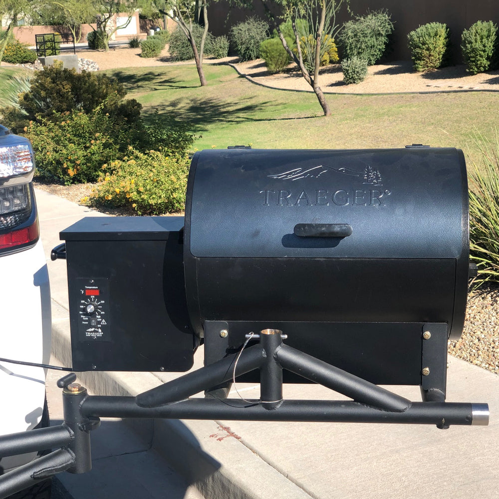 This Hitch Mount Rack comes equipped with a standard driver side tire rack and a passenger side grill mount arm. It has a high lift jack mount with light tabs included (jack and lights are not included), auxiliary hitch receiver, and two stainless steel CNC bottle openers. The rack fits any standard 2” receiver and provides an auxiliary hitch receiver into the rack for towing. Both arms swing away from the vehicle allowing full function of the tailgate on both pickup trucks and SUV’s. Made in USA. Hitch Mount Rack with Cooler/Work Table & Grill Mount:Driver Side Standard Tire Rack Passenger Side Replaced Tire Rack with a Mount for a TREAGER® Grill Grill not included in price. You can use our rack to carry: Utility / fuel jugs High lift jack Spare tire(s) Cooler Grill Tie down straps Hammock And much more TREAGER® is a trademark of Treager Grills. Rack is patented: ( US Patent 10,611,313)Cooler Swing Arm is patented: (US Patent 10,759,351)Anti-Wobble Wedge patented: (US Patent 10,661,722)